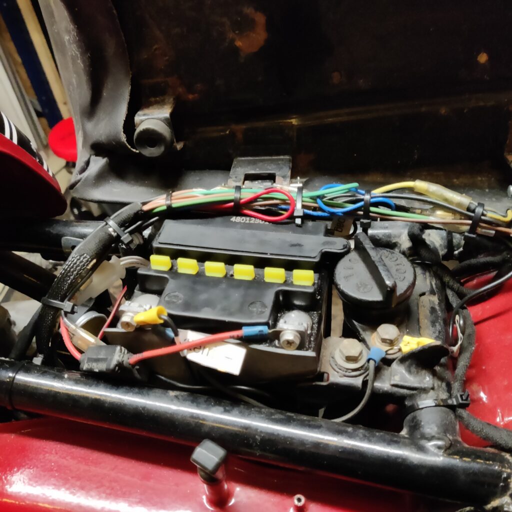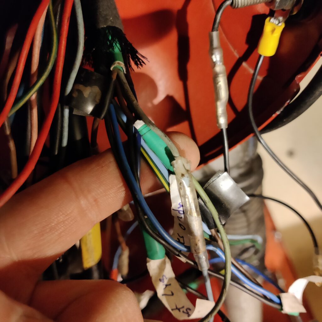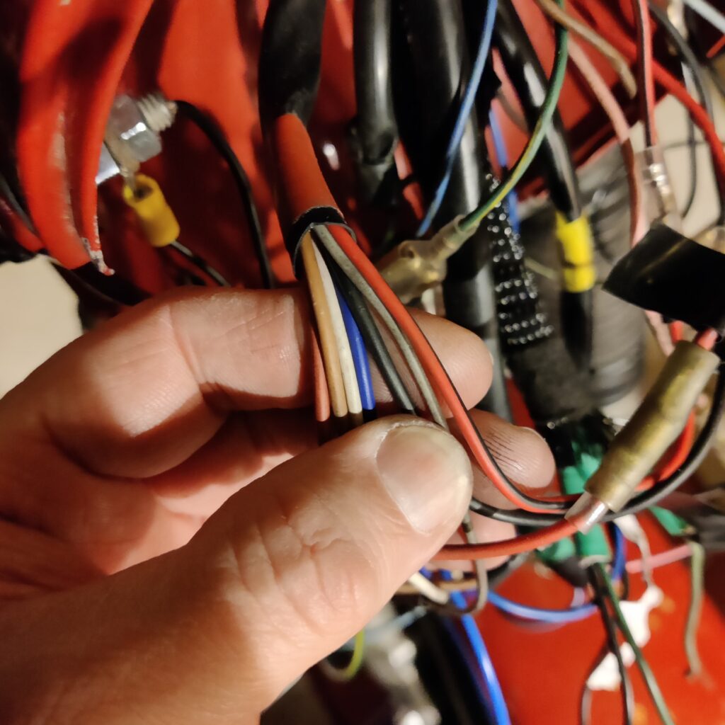 Tilbage til elnettet som jeg tidligere har nævnt. Jeg måtte opgive at bruge det gamle elnet, og gik igang med selv at lave et helt nyt, selvfølgelig lavet med de originale farvekoder. Det er en større opgave, men jeg blev efter en mindre operation i lysken, gjort hjemmegående og måtte ikke løfte noget. Der tænkte jeg det passede perfekt ind at gå igang med at lægge et nyt ledningenet op på spisebordet, måle ledningerne op og lave en gig til at lægge det hele op på. Det gav mig samtidig en forståelse for hvordan strømmen løber rundt på cyklen, og hvad de enkelte farver går til.