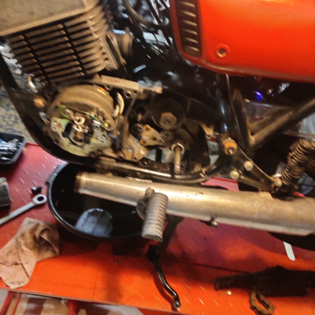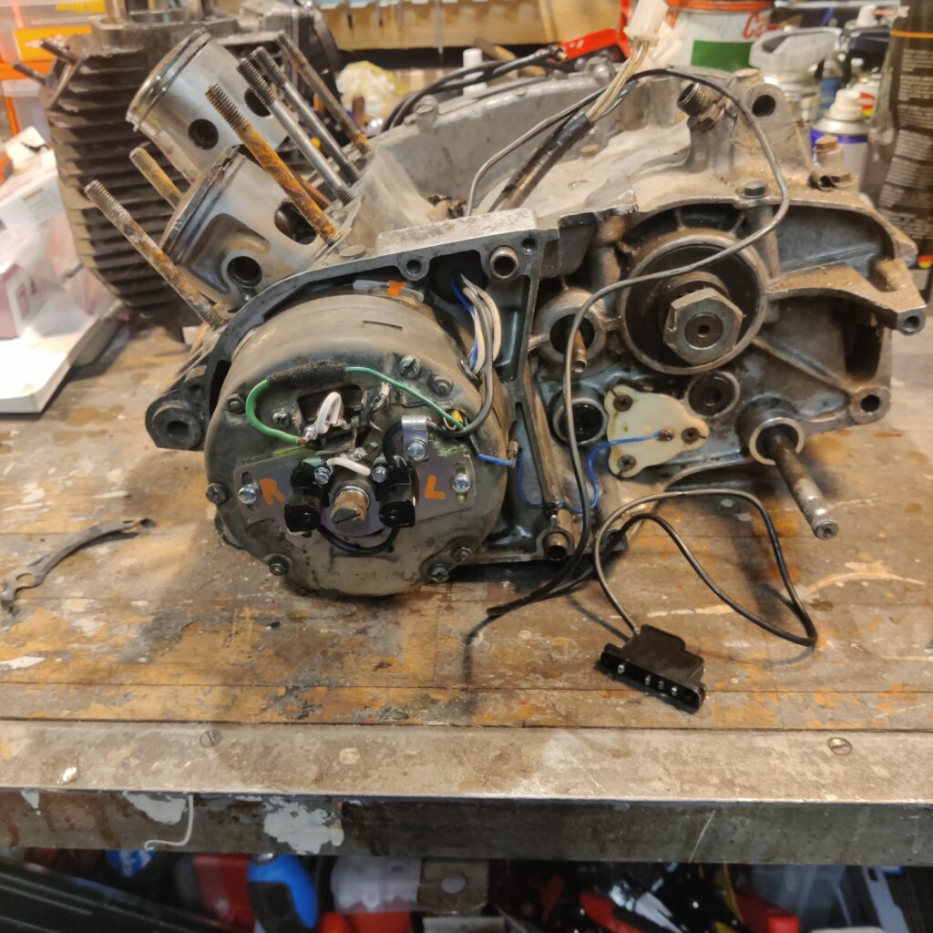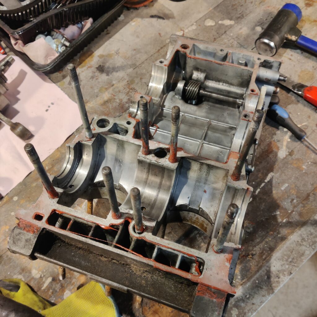Øv øv, efter alt dette arbejde, og trods at den flere gange i forløbet har været startet op, gik ikke fantastisk men den holdt sig igang. Lige nu frygter jeg den trækker falsk luft et eller andet sted, sansynligvis ved en af de 2 oil seals på hver side af krumptappen. Så jeg er nu nået dettil hvor jeg hiver hele motoren ud af stellet og splitter den ad for at pakke den om.