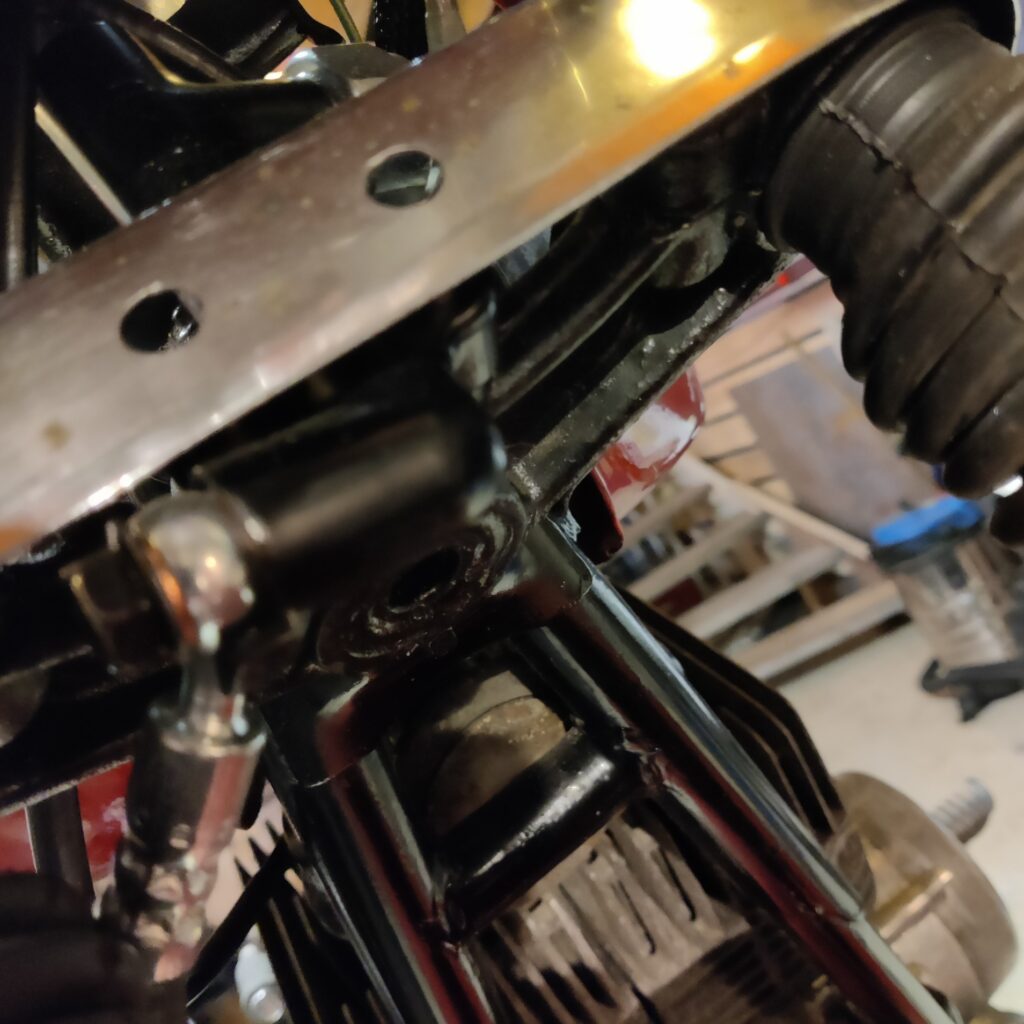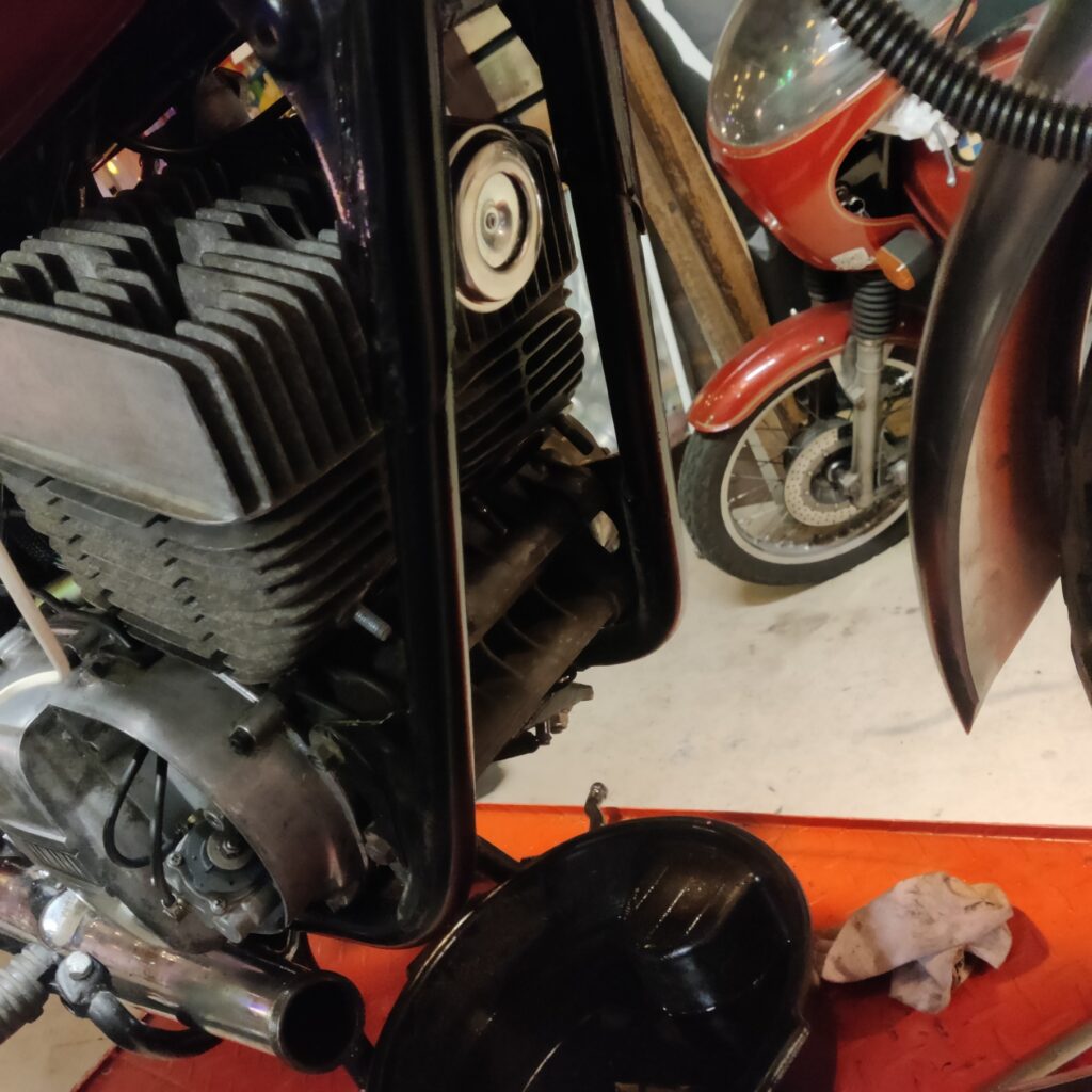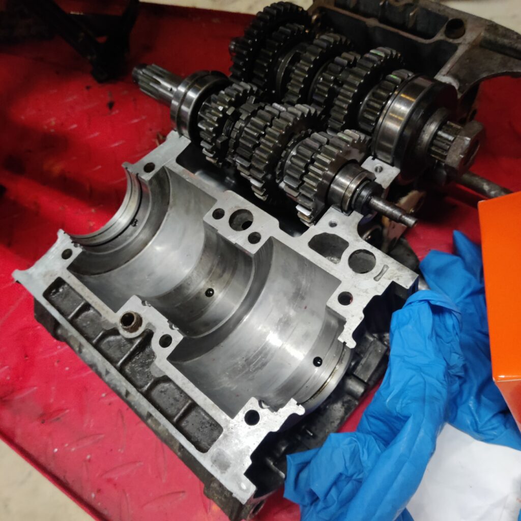 Øv øv, efter alt dette arbejde, og trods at den flere gange i forløbet har været startet op, gik ikke fantastisk men den holdt sig igang. Lige nu frygter jeg den trækker falsk luft et eller andet sted, sansynligvis ved en af de 2 oil seals på hver side af krumptappen. Så jeg er nu nået dettil hvor jeg hiver hele motoren ud af stellet og splitter den ad for at pakke den om.