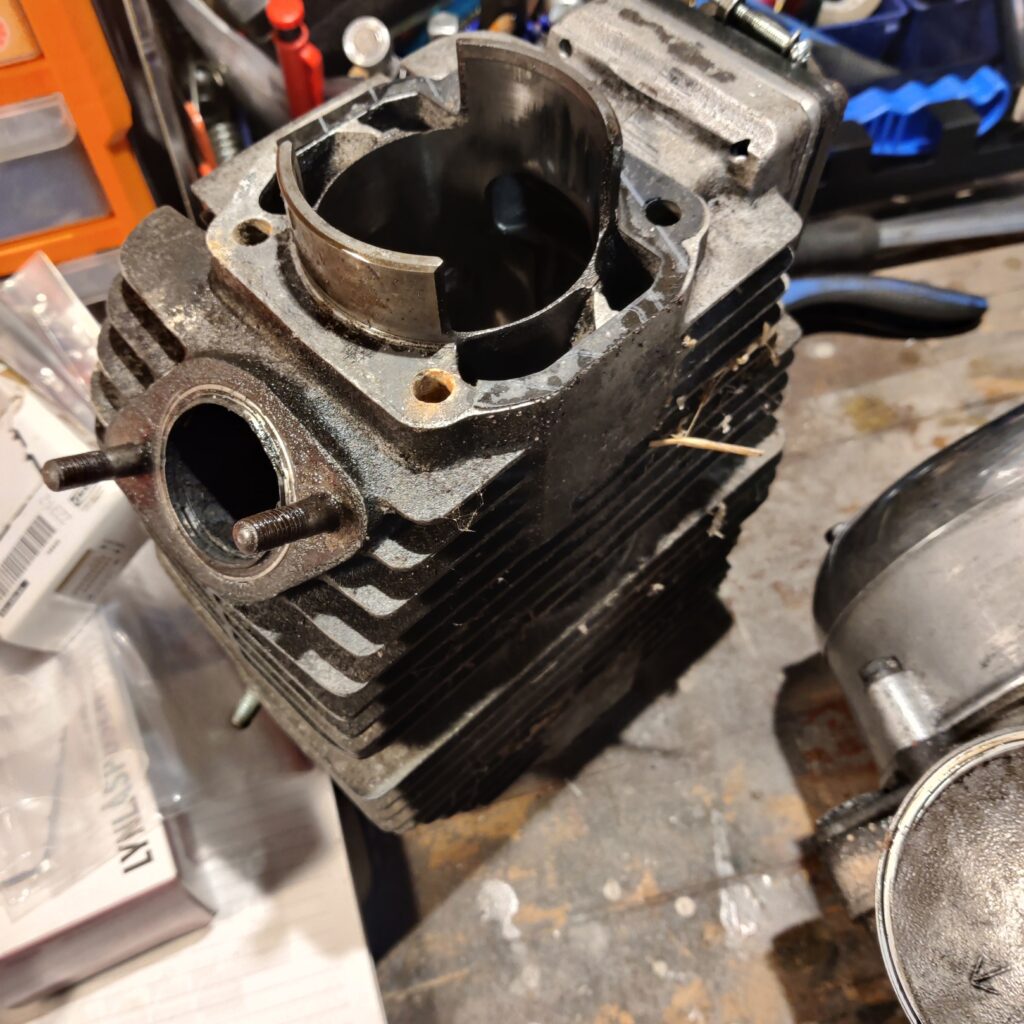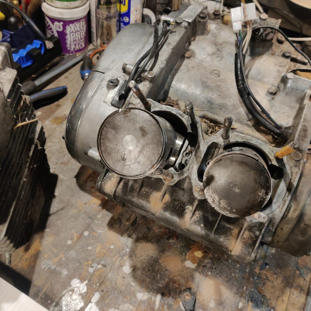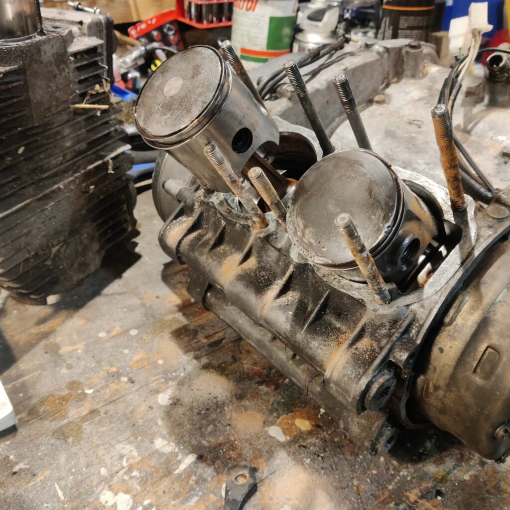 Fik bestilt et sæt pakninger og et sæt pakdåser til motoren. Så langt så godt. Men da jeg tog toppen af kunne jeg med det samme se der var noget helt galt, stemplerne var ikke ens, hverken i udsenende eller i diameter, der var en hel millimeter til forskel!. Så vidre med at hive motoren ud af stellet.