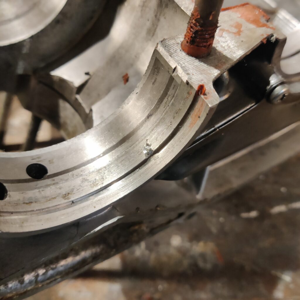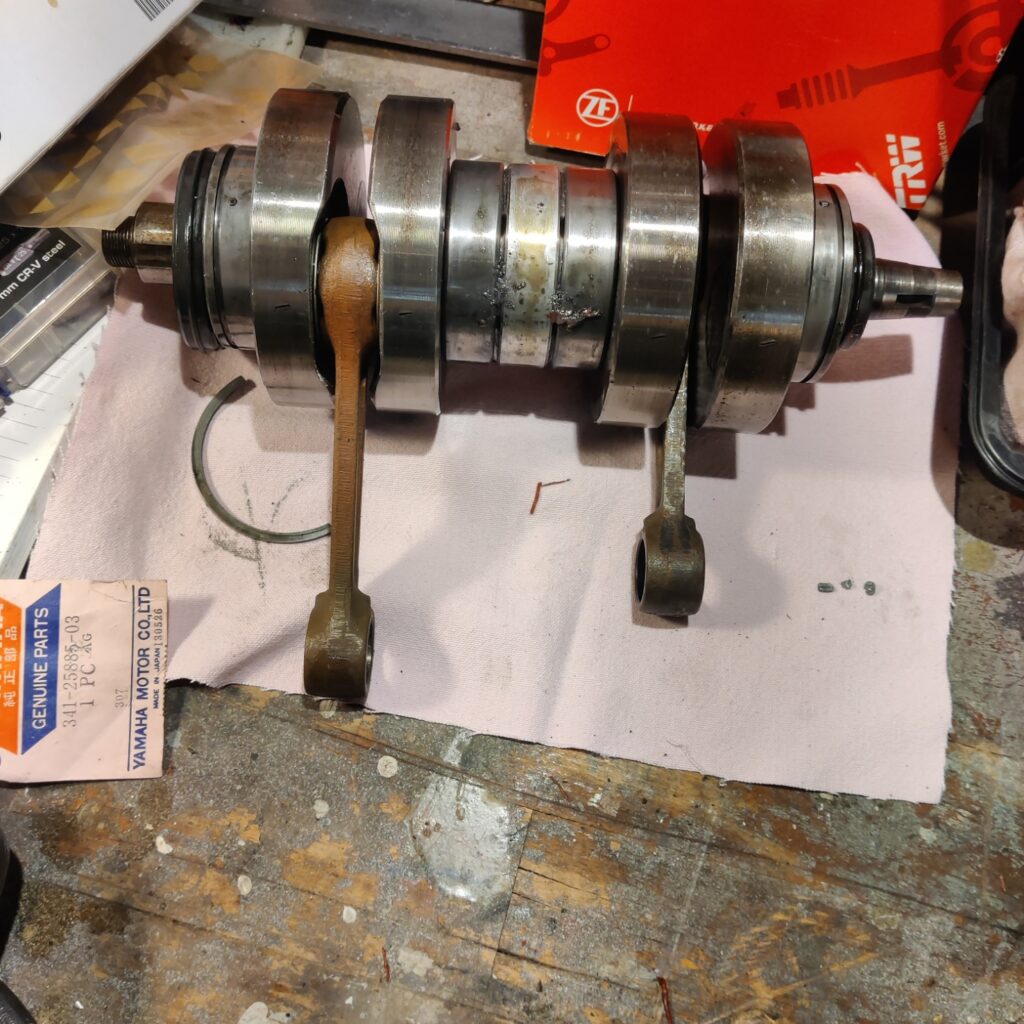 Efter at have taget koblingshuset af, adskilt koblingen og fjernet lidt hist og her, så kunne jeg adskille motorblokken. Da jeg tog krumptappen ud af blokken, så kunne jeg godt se hvad der er galt her. der ligger 3 stykker af en tidligere stempelring i den venstre side af krumptaphuset, de målte cirka 4 x 3 millimeter hver i sær, så ikke bare lidt slidtage, det har været noget der har stoppet den motor. undersøgte venstre cylinder og der er et stort mærke efter en stempelring har været fanget i udstødningsporten på vej ned ad. Det er samme cylinder som er en millimeter større i diameter, hvilket giver god mening, mærket ved udstødningsporten har så været større end det er nu, så et ganske pænt afslag der har været her. stemplet bærer også præg af der han danset noget hård rundt på toppen af det, mange små mærker.